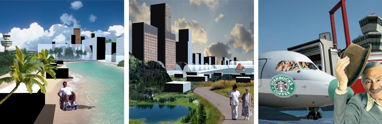 Das Terminalgebäude bleibt äußerlich unverändert. Der check-in-Schalter wird zum Pförtner. Verschiedene Verkehrsmittel stehen zur Verfügung. Freizeitangebote und Natur sorgen für Erholung, die Infrastrukturebene sorgt für medizinische Versorgung.