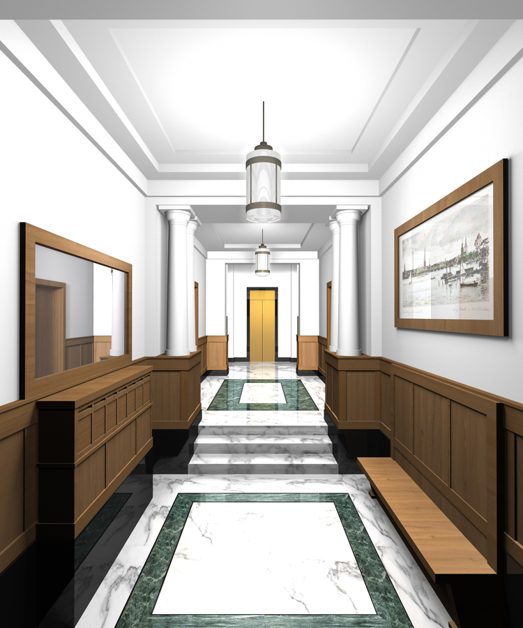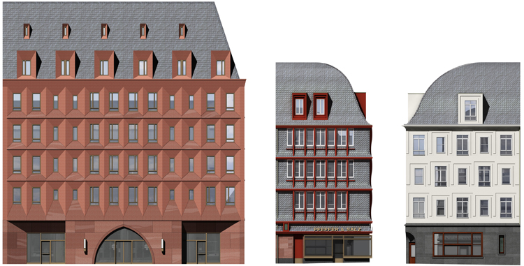 Februar 2011 - Fassadendarstellung von drei Häusern für den Wettbewerb zur Bebauung des Dom-Römer-Areals in Frankfurt für Eingartner Khorrami Architekten