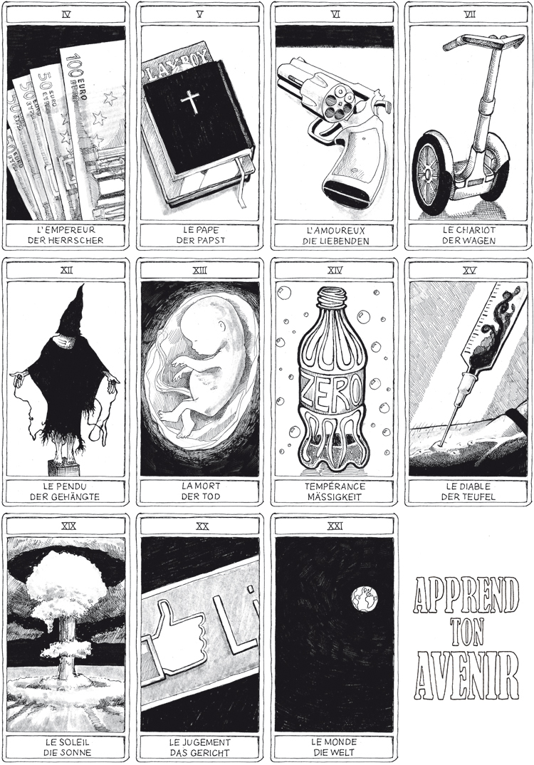 Das Comic habe ich diesmal mit meinem alten Freund Lorne Hart zusammen gezeichnet. Wir haben die 22 Trümpfe des Tarot-Kartenspiels, die so genannten großen Arkana, neu interpretiert. Bei bedarf bitte ausdrucken und auschneiden.