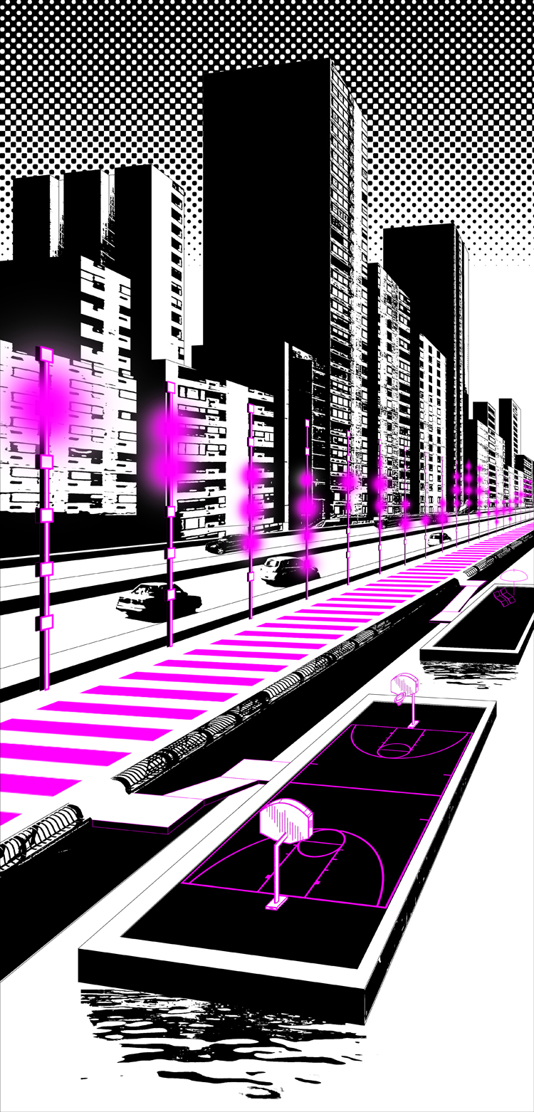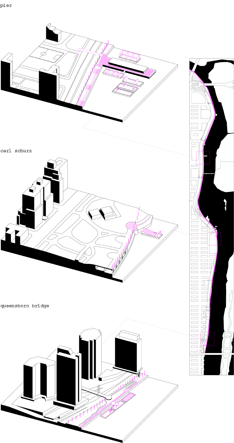 Die Uferpromenade ertreckt sich über mehrere Kilometer durch extrem unterschiedliche Situationen. Weite Strecken sind durch den Franklin D Roosevelt Drive von der Bebauung Manhattans abgeschnitten. Eine Corporate Identity bestehend aus interaktiver Beleuchtung und einem farblich hervorgehonen Weg legt sich über das Vorgefundene und lässt zukünftigen Umgestaltungen einzelner Bereiche größtmögliche Freiheit.