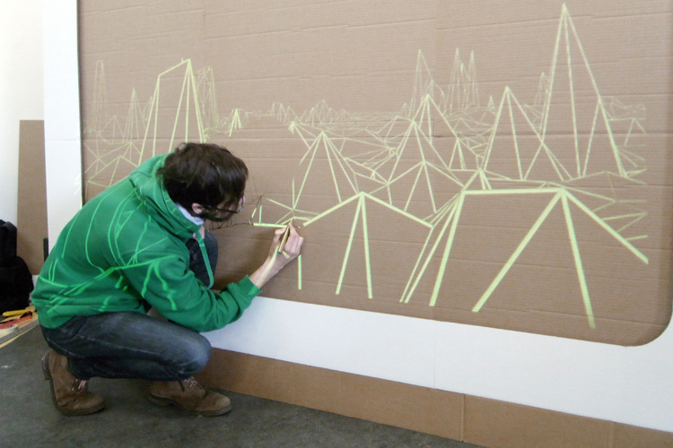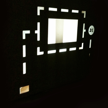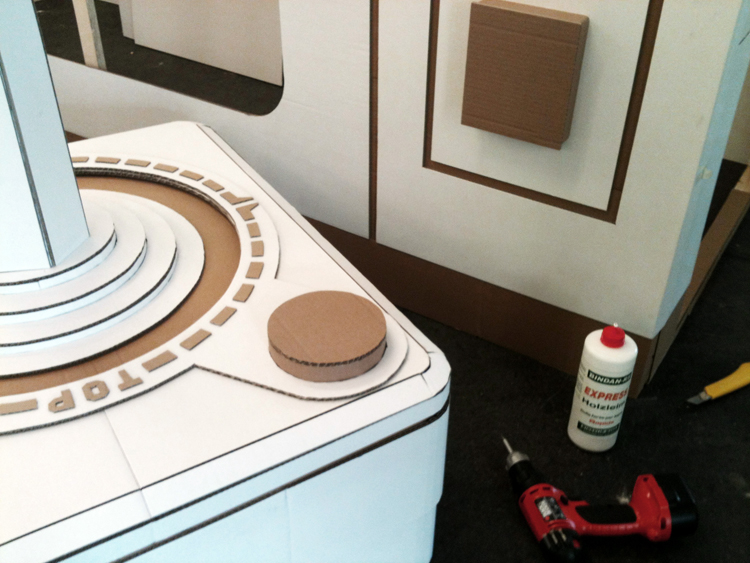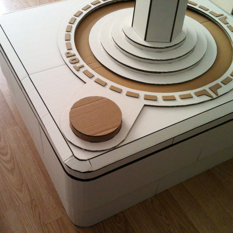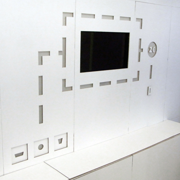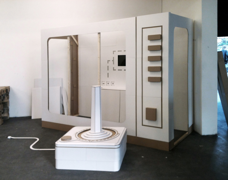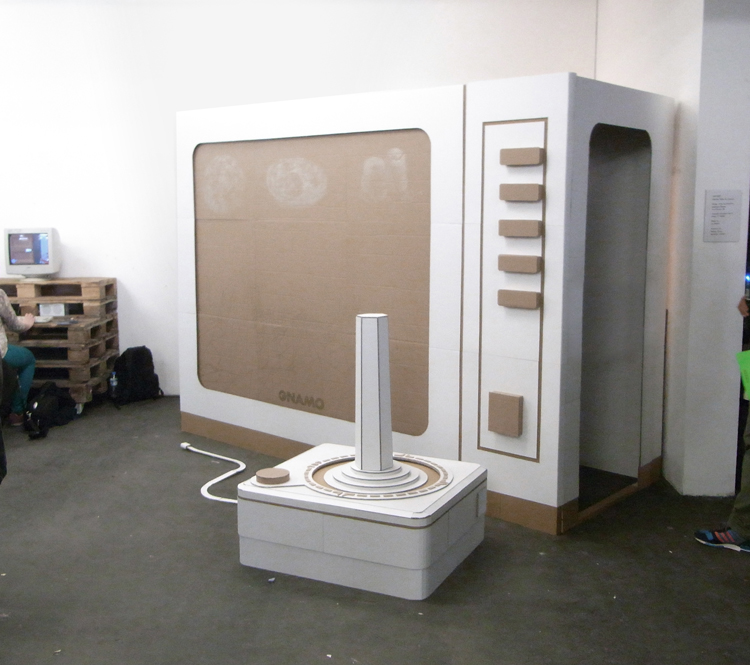 Da auf dem video game festival fast ausschließlich Monitore und Computer in der Umgebung der Installation stehen würden, entwickelte und baute ich die Papp-Installation in Form eines alten Fernsehers. Als kleinen eye-catcher entstand noch der Joystick, der dem Eingabegeräht des Atari 2600 nachempfunden ist.