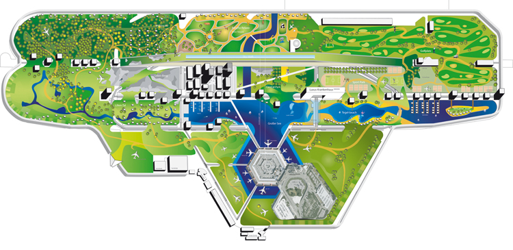 Die einzelnen Bereiche des ehemaligen Flugfeldes werden in unterschiedliche Landschaftszonen umgewandelt. Die Landebahnen sind zu Infrastrukturadern ausgebaut. Pflegemodule bilden ein dezentrales Krankenhaus, angepasst an die Bedürfnisse der Bewohner.